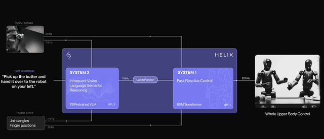 值得一提的是,Helix架构是Figure与OpenAI分道扬镳后的第一个成果,是一个适用于通用人形机器人控制的端到端“视觉-语言-动作”模型(VLA),能让机器人像人一样感知、理解和行动。